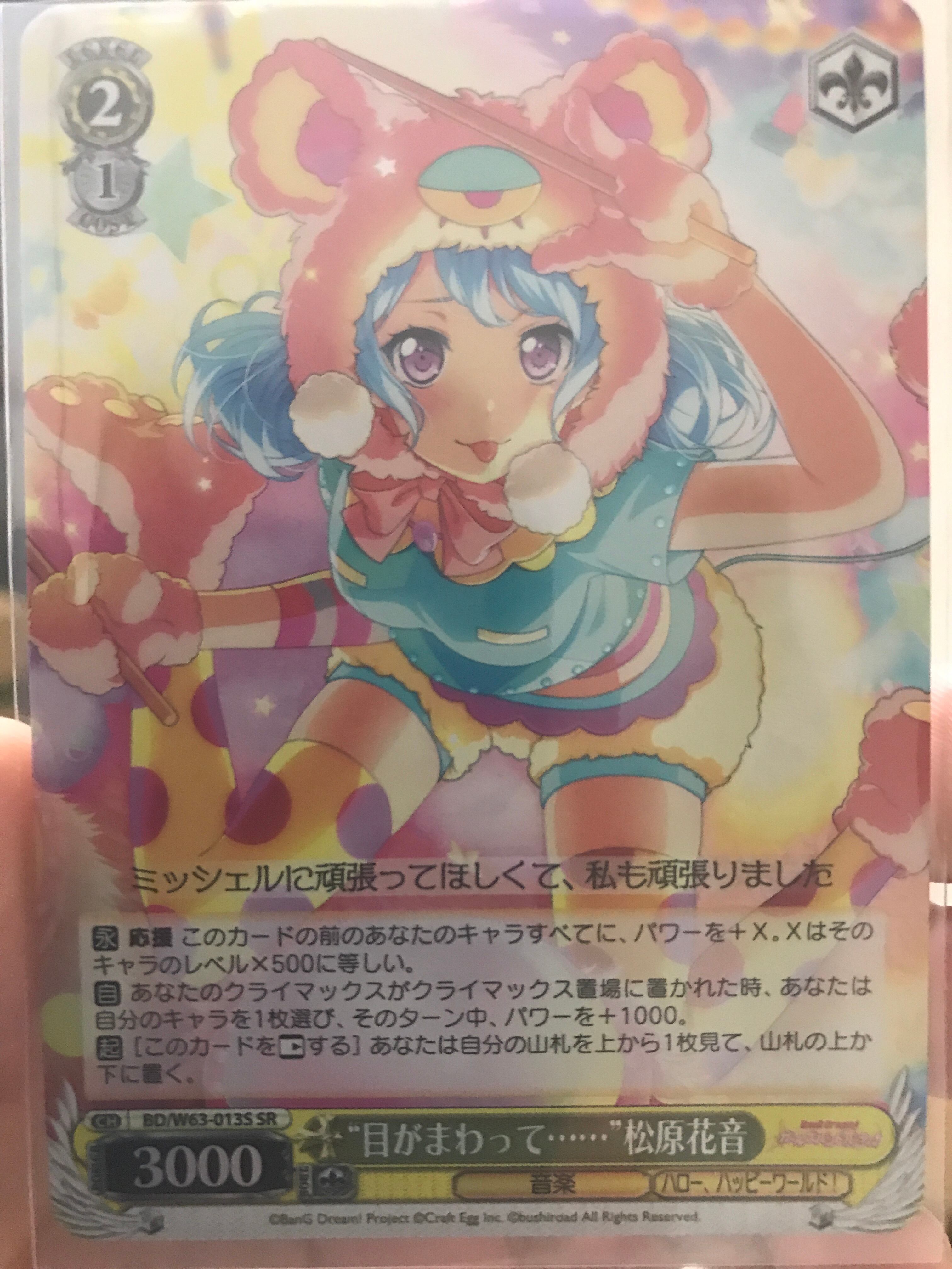 ヴァイスシュバルツシングルカードの目がまわって松原花音のSR版になります。バンドリVOL2のブースターパックで引きました。その後ファイル保存してあります。未使用品になります。プレイ用、コレクション用、購入歓迎いたします。